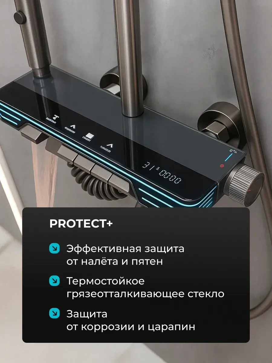регулировка температуры, подсветка панели; Панель с переключателем режимов; встроенный аэратор - расход воды меньше на 30%